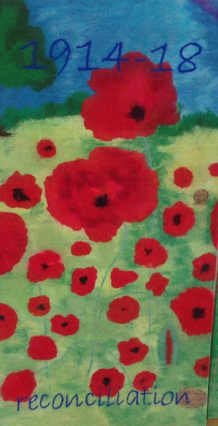Wet felt making is a great process for all ages and abilities. The image below is the third part of a 1.5m high felted triptych made with pupils and staff of Haymerle School, Peckham, London. It commemorates the centenary of the First World War.