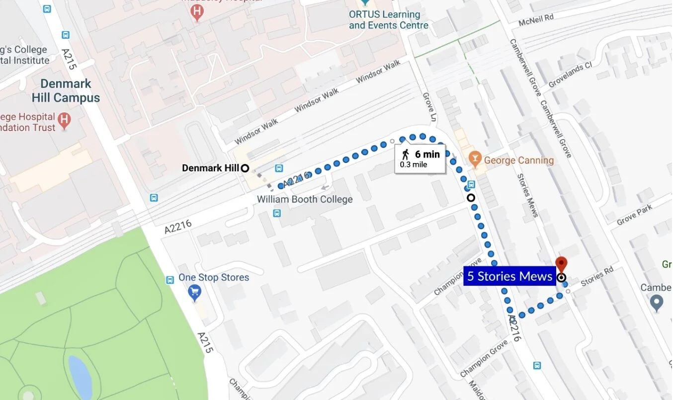 From Denmark Hill Station use the main exit (Champion Hill and buses) and turn left out of the station. Walk up the hill past the George Canning pub on Grove Lane. Stories Road is the next left, (at the post box), take this and then first left onto the Mews.