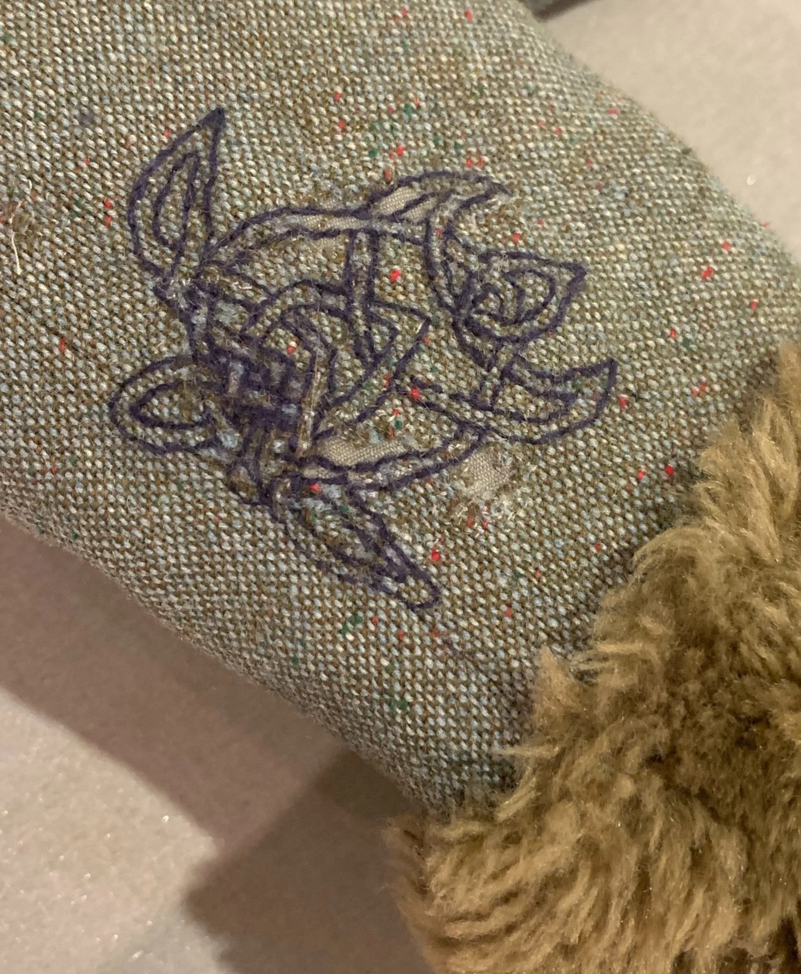 In my adult life I have moved more than 20 times. Each time my precious things have gone back to Lincoln for safe keeping. The last occasion the jacket lived in the hall cupboard there for quite some time. When I eventually retrieved it to my horror, I discovered it had been seriously eaten by moth. I knew it couldn’t go to a textile recycling bin but how to mend it/make it wearable?